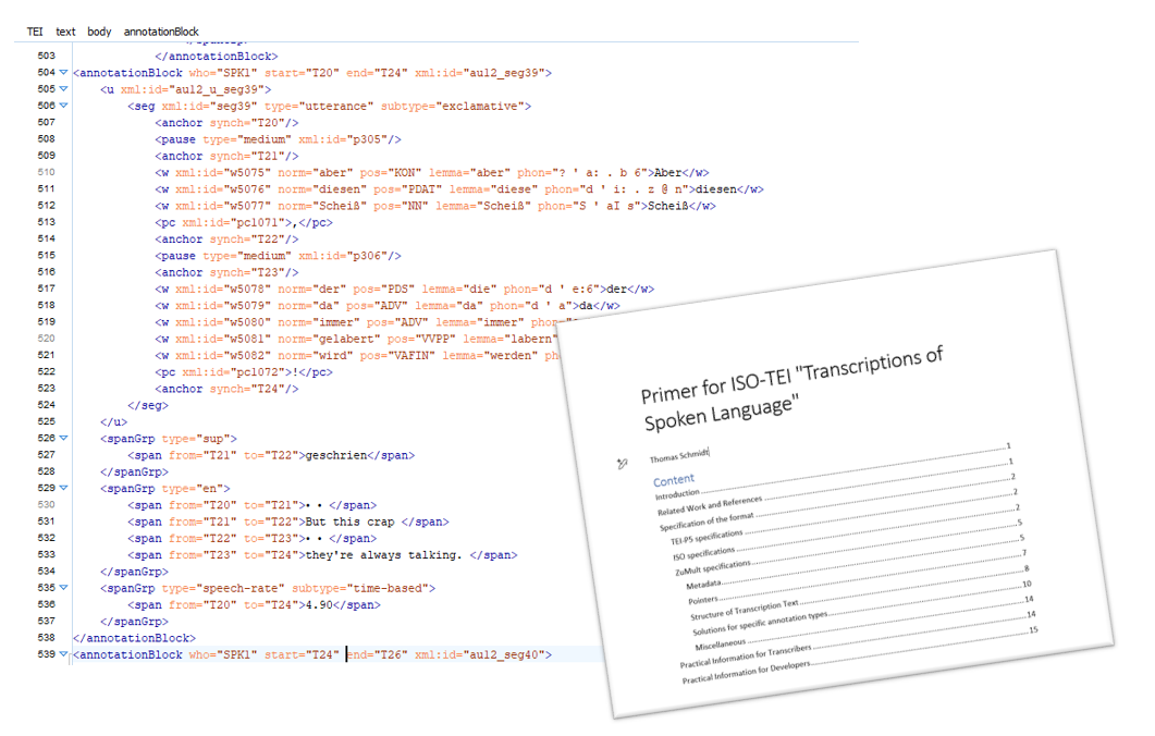 Hanna Hedeland, Thomas Schmidt (2022): The TEI-based ISO Standard ‘Transcription of spoken language’ as an Exchange Format within CLARIN and beyond. In: Selected Papers from the CLARIN Annual Conference 2021. Linköping University Electronic Press: Linköping, pp. 34–45.